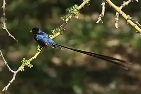 Дрібний птах, завдовжки 10–11 см, вагою 11-13 г. Це стрункий на вигляд птах, із закругленою головою, міцним і конічним дзьобом, загостреними крилами та хвостом з квадратним закінченням. Самці чорні з синюватим металевим відблиском на потилиці, спині, грудях і стегнах, лише махові пера та кінчик хвоста коричневі. Чотири центральних пера хвоста у шлюбний період виростають до 30-32 см завдовжки і теж стають коричневого кольору. На боках тіла є біла пляма, яку видно лише під час розмахування крилами. У самиць верхня частина тіла світло-коричнева, горло та груди сірі. Над очима є світло-сірі брови. В обох статей очі коричневого кольору, а ноги світло-чорнуватого кольору, а дзьоб темно-сірого кольору.