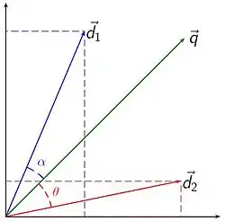 Де — перетин (тобто скалярний добуток) документу та вектори запиту, — нормаль вектора d2, к — нормаль вектора q. Нормаль вектора обчислюється наступною формулою: