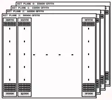 Відеопам'ять організована у вигляді чотирьох 8-кілобайтних сторінок, або бітових площин, які можна включати і відключати програмуванням палітри. Відключені площини можуть бути задіяні як звичайна пам'ять для програм та даних. Змінюючи число задіяних площин відеопам'яті можна отримувати відеорежими з різною глибиною кольору. Так, чотири включених площини дають глибину 4 біта на піксель, тобто 16 одночасно відображуваних кольорів. Дві одночасно працюючих площини дають 2 біта на піксель, або 4 кольори. Одна площина дає монохромне зображення.
