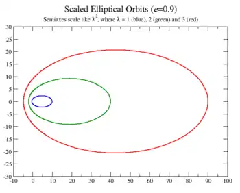 Напрямок також зберігається, оскільки півосі не змінюються при скалюванні. Це перетворення залишає правильним третій закон Кеплера, а саме те, що піввісь і період формують константу .