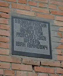 - Меморіальна дошка на честь Героя Радянського Союзу І. І. Шепеля