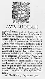 Прості люди створили величезний табір на рівнині Сен-Мішель. 31 липня 1720 року парламент Екс-ан-Прованса заборонив марсельцям залишати свою землю, а жителям Провансу — спілкуватися з ними. Починаючи з 9 серпня, щодня помирало більше ста осіб. Лазарети більше не могли приймати хворих. Трупи викидали на вулиці. У середині серпня лікарі Франсуа Шикойно та Верні з Університету Монпельє приїхали до Марселя за наказом регента за порадою його першого лікаря П'єра Ширака.