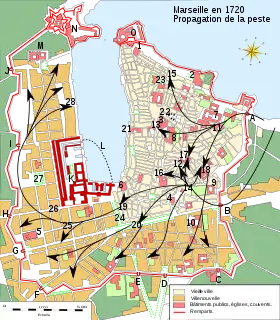 На північ від порту знаходиться старе місто, яке відповідає середньовічній побудові з вузькими звивистими та нездоровими вуличками, де жили ремісники та торговці; саме в цій зоні з'явилася чума і досягла свого максимуму. Ця хвороба становила постійну загрозу для Марселя через часті сталі зв'язки з Близьким Сходом, де це захворювання тоді було ендемічним. Епідемії уражали Марсель неодноразово, особливо в 1580 році, коли чума лютувала найбільше. Система протиепідемічного захисту поступово вводилася в дію і демонструвала свою ефективність, оскільки до 1720 року Марсель не зазнав епідемій чуми впродовж шістдесяти років. Цей захист базувався, з одного боку, на санітарному кордоні, створеному в середземноморському масштабі з видачею ліцензій у портах Леванту, а з іншого боку, на офісному персоналі, який складався зі стюардів, які визначали тривалість карантину для екіпажу, пасажирів і вантажу. Кожному кораблю, який заходив у порт Леванту, видавалася ліцензія, сертифікат, виданий консулами східних портів капітанам суден, які бажали повернутися до Франції, в якому вказувався стан благополуччя міста. Існувало три типи ліцензії: