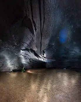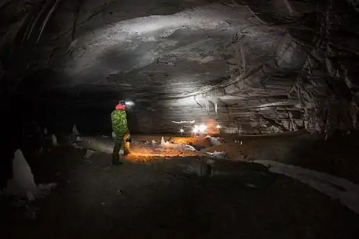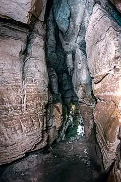 Печера являє собою горизонтальну низку гротів зі стінами блакитно-білого кольору та підлогою, покритою в'язкою глиною.