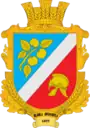 Квадратне полотнище поділене від нижнього древкового кута білою діагональною висхідною смугою шириною в 1/10 від ширини прапора. На синій древковій частині жовта гілка яблуні з трьома яблуками, на червоній вільній жовтий римський шолом.