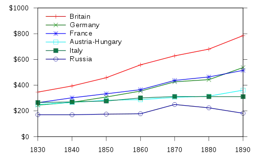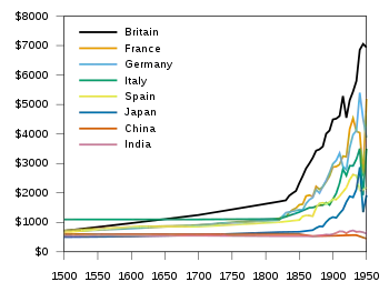 За словами Поля Байроша, в середині XVIII століття «середній рівень життя в Європі був трохи нижчим, ніж у решті країн світу».[19] За його оцінками, в 1750 році, середній ВНП на душу населення в східному світі (зокрема в Китаї, Індії і на Близькому Сході) був $188 в еквіваленті 1960 року ($830 в еквіваленті 1990 року), тобто вище, ніж $182 ($804 в еквіваленті 1990 року) на Заході. [94] Він стверджує, що саме після 1800 року західноєвропейський дохід на душу населення пішов вперед.[95] Однак середні доходи Китаю[89] та Єгипту [92] все ще були вищими за загальний середній дохід Європи. [92]