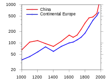 Китай мав більше населення, ніж Європа, упродовж нашої ери.[33] На відміну від Європи, він був політично об'єднаним упродовж довгого періоду.