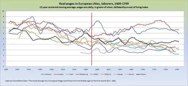 В епоху Великих географічних відкриттів мореплавці відкрили нові шляхи до Америки та Азії. Торгівля розширювалась разом із нововведеннями, такими як акціонерні товариства та різні фінансові установи. Нові військові технології надавали перевагу більшим підрозділам, що призводило до концентрації влади в державах, фінанси яких покладалися на торгівлю. Франція та Іспанія розвинули абсолютні монархії, що базувались на високих податках та державних монополіях, що вело до економічного занепаду. Голландська республіка контролювалась торговцями, у той час як Парламент отримав контроль над Англією після тривалої боротьби, кульмінацією якої стала Славна революція. Ці події виявились більш сприятливими для економічного розвитку.[30] Наприкінці XVI століття Лондон та Антверпен почали відходити від інших європейських міст, як це показано на наступному графіку реальної заробітної плати в кількох європейських містах:[31]