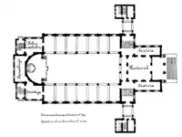 Головна молитовна зала зведена прямокутною в плані розміром 29 на 33 метри. Бокові нави мали ширину 8,5 метри, середня нава — 10,5 метри. До головної зали провадило квадратне передсіння зі сторонами розміром 17,5 метрів, по боках котрого знаходились гардероби. Ззовні передсіння було завершене пласким куполом.