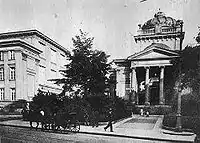 22 травня 1872 року прийнято рішення про влаштування першого архітектурного конкурсу, що розпочався 11 липня того ж року. Комітет виставив дуже високі вимоги, а вартість будівництва повинна була складати 150 тисяч рублів. Крайній термін для надсилання проектів настав 1 березня 1873 року. Прислано 6 робіт, що їх перед оцінкою виставлено в будинку Народної галереї мистецтв Захента. Першу нагороду розміром 750 рублів отримала спілка Броніслава Жоховського й Теофіла Лемке, а другу, розміром 300 рублів отримав Ян Кацпер Гойріх. Однак члени комітету відкинули ці проекти, оскільки вони відповідали не усім вимогам.