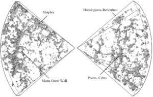 Велика стіна Слоуна приблизно втричі більша за Велику стіну CfA2, яка вважалася найбільшою до того. Променева швидкість ядра надскупчення галактик становить Vr=24403 км/сек (тобто, воно віддаляється від нас із такою швидкістю), що відповідає червоному зсуву z~0,085[1].