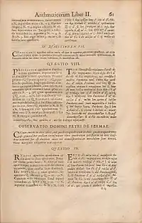 Оригінальний текст (лат.) Cubum autem in duos cubos, aut quadrato-quadratum in duos quadrato-quadratos, et generaliter nullam in infinitum ultra quadratum potestatem in duas ejusdem nominis fas est dividere; cujus rei demonstrationem mirabilem sane detexi. Hanc marginis exiguitas non caperet. |