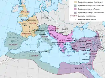 На Заході, однак, відхід від справ Галерія призвів до краху системи тетрархії. Костянтин, син Констанція, і Максенцій, син Максиміана, не були враховані в діоклетіановской схемі спадкування, що ображало батьків і синів. Костянтин, проти волі Галерія, успадковував своєму батькові 25 липня 306 року і відразу ж припинив гоніння і запропонував християнам повне відшкодування втраченого в роки переслідувань. Максенцій, який захопив владу в Римі 28 жовтня того ж року, теж незабаром оголосив про терпимість до християн. Галерій зробив дві невдалі спроби змістити Максенція, але під час другої з них Флавій Север був схоплений і страчений.