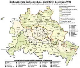 У виниклому Великому Берліні було утворено 20 міських районів. Зі старого Берліна утворилися райони: Мітте, Тіргартен, Веддінг, Пренцлауер-Терґ, Халлешес-Терґ і Фрідріхсхайн (з селом Штралау). Із приєднаних міст і сільських громад були утворені райони Шарлоттенбург, Шпандау, Вільмерсдорф, Шенеберг, Нойкельн, Кепенік, Ліхтенберг, Панков, Райнікендорф, Штегліц, Целендорф, Темпельхоф, Трептов і Вайсензеє, які отримали назви по найбільшим, які входили до їх складу адміністративних одиниць.