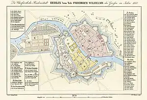 1 березня 1816 року в провінції Бранденбург королівства Пруссія були виділені три адміністративні округи: Берлінський, Потсдамський і Франкфуртський. Берлінський адміністративний округ включав до свого складу безпосередньо місто Берлін (в його тодішніх межах — див. мапу), а також його околиці — поселення Моабіт, Веддінг, Луізенбруннен, Боксхаген, Руммельсбург, Штралау, території Темпельховського і Шьонеберзького форштадту, а також Хазенхайде і Великий Тіргартен.