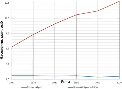 Населення власне міста Буенос-Айрес з 1940-х років зменшується, водночас помітна тенденція зростання кількості мешканців передмість, за рахунок чого населення Великого Буенос-Айреса росте.