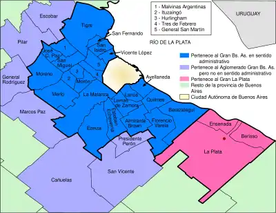 1948 року влада провінції Буенос-Айрес видала декрет, згідно з яким 15 округів, найближчих до столиці отримали назву Великий Буенос-Айрес[6]. Цими округами були: