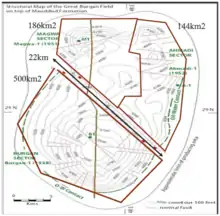 Входить у нафтогазоносний басейн Перської затоки. Приурочене до похованого куполу, який складається з трьох піднять: Бурган, Магва і Ахмаді. Загальні розміри структури 46х20 км. Поклади пластові склепінчасті. Поч. промислові запаси нафти 10693 млн т. Продуктивні пісковики світ вара, мауддуд, бурган і зубайр крейдового віку, а також вапняки, що залягають на глибині 970-3000 м. Основний видобуток (90 %) забезпечують III і IV продуктивні горизонти світи бурган на глиб. 1050—1100 (2600) м. Колектори ґранулярні, пористі. Нафти середні і важкі, сірчисті і високосірчисті. Густина нафти 868 кг/м3, в'язкість 1,1·10-2 Па·с; вміст S -1,5 %.