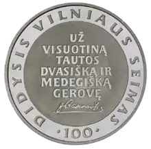 До 100-річчя Великого Вільнюського сейму 2005 року було випущено монету номіналом 50 литів[4]. Автор графічного проєкту монети — художник Альбертас Гурскас, автор гіпсових моделей — художник Ритас Йонас Белявичюс.