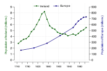 Голод ознаменував початок депопуляції в Ірландії в 19 столітті. В перших трьох десятиліттях 19-го століття населення зросло на 13-14 % ; між 1831 і 1841 роками кількість жителів збільшилась на 5 %. Ідея Томаса Мальтуса про те, що населення зростає в геометричній прогресії, а ресурси збільшуються в арифметичній, була популярною під час голоду 1817 і 1822 років. До 1830 року її сприймали як надмірно спрощену, і в Ірландії проблеми бачили «менше через надлишок населення, ніж через нестачу капітальних вкладень.»[108] Населення в Ірландії зростало не швидше, ніж в Англії, яка не постраждала від еквівалентної катастрофи. До 1854 року від 1,5 до 2 млн. ірландців покинули свою країну через виселення, голод і суворі життєві умови.