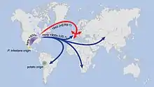 Як і коли Phytophthora infestans прибула в Європу все ще залишається невизначеним; однак, її майже напевно не було до 1842 року, і, ймовірно, вона прибула 1844 року[27]. Походження збудника простежено до долини Толука в Мексиці[28], Звідки він поширився спочатку по Північній Америці, а потім у Європу[27]. У 1845—1846 роках псування було викликане штамом фітофторозу HERB-1[29].