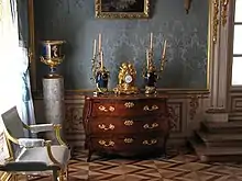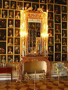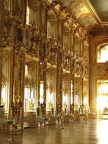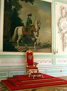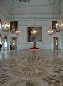 Шовк, прикрашає стіни цієї кімнати, витканий в середині XIX сторіччя за малюнком П. Дверза, відтворює тканину XVIII сторіччя. На стінах — парадні портрети. Позолочена різьба відтворена під керівництвом О. Семенова за моделями Н. Оде.