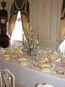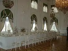 Біла їдальня замикає анфіладу великих парадних зал палацу. Її розташування в плануванні проводить межу між офіційними залами й приватними палацовими покоями.