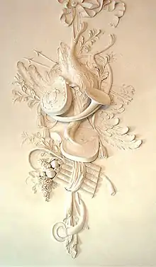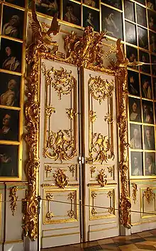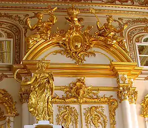 Але основним елементом декору, традиційним для растреллівських інтер'єрів, є позолочена різьба по дереву. Виконання робіт відноситься до 1751 році; бригаду російських майстрів очолював Йосип Шталмеєр. Нижню частину сходів прикрашають різьблені каріатиди, відтворені в повоєнні роки за моделями скульпторів Г. Михайлової й Е. Масленникова. Найпомітніші скульптури верхньої частині — алегоричні зображення пір року, прикрашають верхню площадку сходів. Весна, Літо (на перилах), Осінь й Зима (поміщені в нішах навпроти перших) представлені в образі юних дівчат. Повторення скульптур «Весна», «Літо» та «Осінь» також виконали Г. Михайлова та Е. Масленников. Скульптура «Зима», в роки німецько-радянської війни була евакуйована ійзбереглася. Дверний портал, що веде в Танцювальний зал, вирішено у формах тріумфальної арки. Окрасою монументального десюдепорта служать дві різьблені фігури «Вірність» й «Справедливість».. Портал відтворено за моделями С. Лебедєвої.