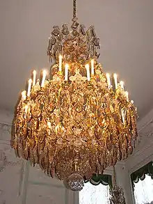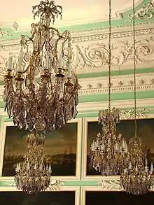 Стеля вітальні прикрашає овальний плафон, алегорично зображує Ранок, що жене Ніч (невідомого французького художника XVIII сторіччя). Раніше стеля була розписана темперою художниками братами Олексієм й Іваном Бєльськими, але розпис безповоротно загинув за німецько-радянської війни.