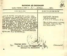 ЦК ВКП(б) пропонує всім секретарям обласних і крайових організацій і всім обласним, крайовим і республіканським представникам НКВС узяти на облік всіх куркулів, що повернулися на батьківщину, і кримінальників для того, щоб найбільш ворожі з них були негайно арештовані й були розстріляні в порядку адміністративного проведення їхніх справ через трійки, а інші менш активні, але все-таки ворожі елементи були б переписані й вислані в райони за вказівкою НКВС. ЦК ВКП(б) пропонує в п'ятиденний строк представити в ЦК склад трійок, а також кількість тих, що підлягають розстрілу, так само як і кількість тих, що підлягають засланню".[9] | |
