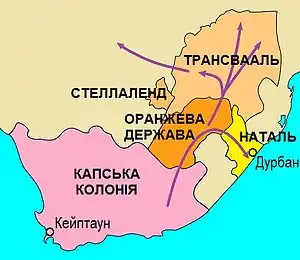 Бури змушені були мігрувати на північ і північний захід, у внутрішні райони Південної Африки, де утворили дві нові республіки: в 1852 році Південно-Африканську Республіку (вона також називалася Трансвааль) зі столицею в Преторії, і в 1854 році — Оранжева Вільна держава зі столицею в Блумфонтайні.