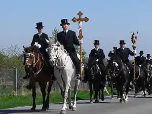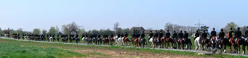 У пасхальну неділю перед початком ходи в церкві населеного пункту, в якому збираються кіннотники, проводиться служба, на якій вони отримують благословення, після чого і вирушають в дорогу. Чоловіки одягнені в чорні фраки, на головах циліндри. Попереду процесії знаходяться вершники з хоругвами, статуями Христа і хрестами. Як правило організовується також зустрічна хода, тому одночасно можна спостерігати відразу кілька процесій. Маршрути процесій, кожна з яких може складати до сотні вершників, не повинні перетинатися, оскільки, за повір'ям, це може принести нещастя.
