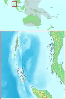Ендемік Нікобарських островів, що належать Індії. Два підвиди трапляються на 14 островах: M. n. abbotti на Великому Нікобарі, Малому Нікобарі, Кондулі, Менчалі, Трісі, Мерое та М. n. nicobariensis на островах Каморта, Трінкат, Нанкоурі, Катчалл, Тересса, Бомпока і Тілланхонг. Загальна популяція виду оцінюється у 750-1500 птахів.