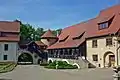 Комплекс складається з витягнутого прямокутного у плані корпусу офіціни та, прилеглої до неї із заходу, квардратної у плані головної будівлі з розташованим по осі коридором. Головна будівля покрита шатровим дахом. Офіцина має гребінчастий дах з численними мансардами. На осі переднього фасаду виступає портал з ключем та датою 1765 року. З боків на плінтусах розташовані гладкі пілястри, що підтримують карниз. З інтер’єрів головного корпусу збереглися лише склепінні підвальні приміщення та першого поверху (початок XVII і XVIII століть). У офіцині більшість кімнат зберегли свій історичний характер. Значну частину займає велика бальна зала, що своєю висотою сягає двох поверхів, на східній стороні виступає емпора, підтримувана тосканськими колонами. Стеля має облямування неіснуючого нині плафону. Поруч з бальною кімнатою збереглася кімната з каміном, на якому міститься чавунний герб родини Столбергів із вище розміщеною князівською короною. Внутрішня частина каміна наповнена ренесансними чавунними різьбленими плитами, які швидше за все походять, з Нижньої Саксонії, можливо, з резиденції родини Верніґероде .