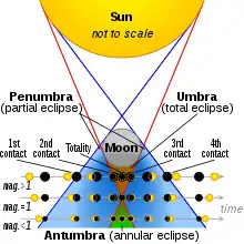 Коли величина затемнення менша від 1, то місячний диск не може повністю закрити диск Сонця. Коли центри обох дисків перебувають достатньо близько один від одного, то диск сонячного світла залишається видимим навколо Місяця. Таке затемнення називається кільцеподібним[2].