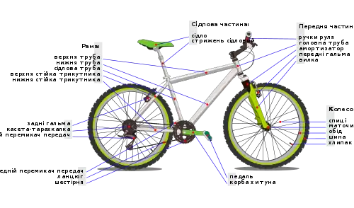 Велосипед складається з рами, на яку кріпляться колеса, кермо з вилкою керма, що повертає переднє колесо, педалі на шатунах і сідло, зазвичай з амортизатором. Педалі крутять колесо через ланцюгову передачу, вал або ремінну передачу. Велосипед, також, обладнаний ручним чи ножним гальмом.