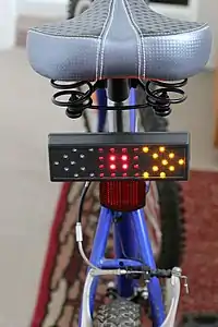 Правилами дорожнього руху України не регламентується використання велосипедистами світлових вказівників повороту і стоп-сигналів, попередження про маневр здійснюється витягнутою вбік, піднятою вверх чи зігнутою в лікті рукою[9]. Але багато саморобних і заводського виробництва задніх велосипедних ліхтарів оснащуються вказівниками поворотів оранжевого кольору, що мигають з частотою близькою до 2 Гц та стоп-сигналом червоного кольору постійного свічення. Керування вказівниками поворотів здійснюється з допомогою перемикача, що як правило, кріпиться на кермо, а стоп-сигнал активується за допомогою вимикача, що кріпиться на тросі заднього гальма.