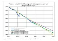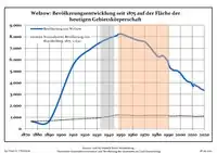 Динаміка населення з 1875 року в сучасних кордонах (Синя лінія: населення; Пунктир: відносна порівняльна динаміка населення землі Бранденбург; Сірий фон: період Третього рейху; Помаранчевий фон: період НДР)