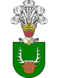 В блакитному (чи зеленому) полі пінь, увінчаний рогами оленя. Нашоломник: п'ять страусиних пір'їв.