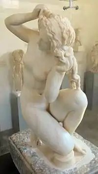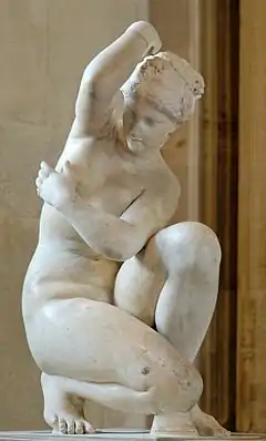 - Відомі маленькі бронзові статуї «Венери навпочіпки». Одна з них знайдена в Сирії, колись була в колекції Жозефа Дюрігелло, потім куплена Галереєю імені Жоржа Петі (Galerie Georges Petit) в Парижі.