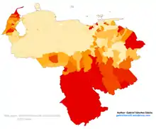 станом на липень 2020 року населення Венесуели становить 28 435 940. Венесуельський народ є результатом Метисація між європейцями (іспанцями, італійцями та португальцями) з Індіанці та меншою мірою африканцями. За даними аутосомного генетичного дослідження ДНК, проведеного в 2008 році університетом Бразилії, склад населення Венесуели складає: 60,60% від європейського внеску, 23% Індіанці та 16,30% внеску Африканський[32].За результатами опитування, проведеного 2016 році, 33% венесуельців назвали себе Метиси, 32% - Білі люди, 21% - Мулати, 8% - чорною та 4% - Індіанці.[33]