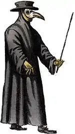 Італійці ж запозичили цю маску, щоб захиститися від жахливого смороду, що вразив Венецію у 1630-х рр. Карнавальний костюм включав також довгий чорний плащ, білі рукавички і палицю (для переміщення пацієнтів, не торкаючись зачумлених руками).