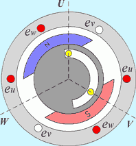 Фотоелектричний датчик в класичному вигляді містить три нерухомі фотоприймачі, які по черзі закриваються шторкою, що обертається синхронно з ротором. Це показано на малюнку. Двійковий код, що одержується з ДПР фіксує шість різних положень ротора. Сигнали давачів перетворюються керуючим пристроєм в комбінацію керуючих напруг, які керують силовими ключами, так, що в кожний такт (фазу) роботи двигуна включені два ключі і до мережі підімкнені послідовно дві з трьох обмоток якоря. Обмотки якоря U, V, W розташовані на статорі із зсувом на 120° і їх початки і кінці з'єднані так що при перемиканні ключів створюється обертове магнітне поле.
