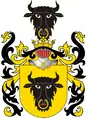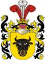 На золотому полі зображення чорної голови зубра із золотим кільцем в ніздрі.