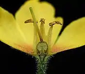 Суцвіття — нещільна кінцева складна китиця; квітки самотні або в парах. Віночок колесоподібний, жовтий, 12–20 мм шириною, короткотрубковий, 5-пелюстковий; пелюстки зі звуженими кінчиками, поля залозисто-волохаті. Чашолистки вузькі, повністю зелені або червоні. Тичинок 5. Плід — сферична, 5-клапанна, довша за чашечку, 4 мм завдовжки коробочка[3].