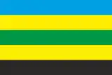 Прямокутне полотнище прапора складається з п'яти горизонтальних смуг: верхня – синього кольору, нижня – чорного кольору та двох жовтих, розділених зеленою смугою. Співвідношення ширини до довжини 2:3.