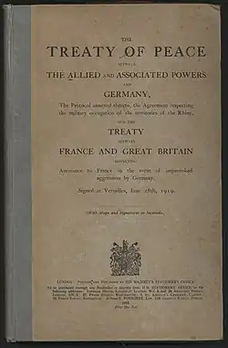 Версальський мирний договір — підписаний у Версалі 28 червня 1919 року державами-переможницями у Першій світовій війні (США, Великою Британією, Французькою республікою, Королівством Італія, Японською імперією, Бельгією тощо) з одного боку, і переможеною Німеччиною — з іншого. З іншими центральними державами, які воювали на стороні Німецької імперії у Першій світовій війні були підписані окремі договори.[1] Хоча перемир'я, підписане 11 листопада 1918 року, фактично закінчило бойові дії, знадобилося шість місяців переговорів на Паризькій мирній конференції щодо укладання мирного договору. Договір був зареєстрований у секретаріаті Ліги Націй 21 жовтня 1919 року, і надрукований в Treaty Series.