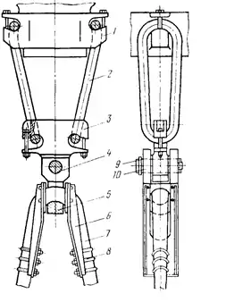 З'єднання вертлюга з автоматичним елеватором здійснюється за допомогою пристрою (рис. 5), що складається з петльових стропів 2, перехідної скоби 3 і траверси 5. Траверса надівається на строп 7 вертлюга і з'єднується з перехідною скобою віссю 4, закріпленою гайкою 9 і шплінтом 10. Положення траверси фіксується рамками 6, закріпленими на стропі вертлюга хомутами 8.