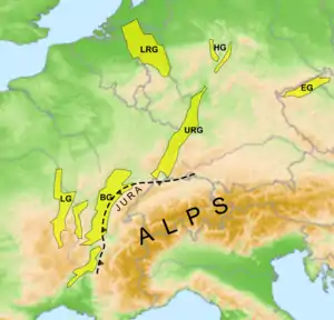 Є частиною європейської кайнозойської рифтової системи, яка простягається по всій центральній Європі. Грабен було утворено в олігоцені через еволюцію Альп на півдні; він залишається активним до наших днів. Сьогодні грабен утворює долину, якою тече річка Рейн.