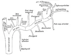 | Гілки | Відділ І Нижня альвеолярна артерія Глибока вушна артерія Середня менінгеальна артерія Відділ II Верхня задня коміркова артерія Жувальна артерія Крилопіденбінні гілки Глибокі скроневі артерії Щічна артерія Відділ III Підочноямкова артерія Нисхідна піднебінна артерія |